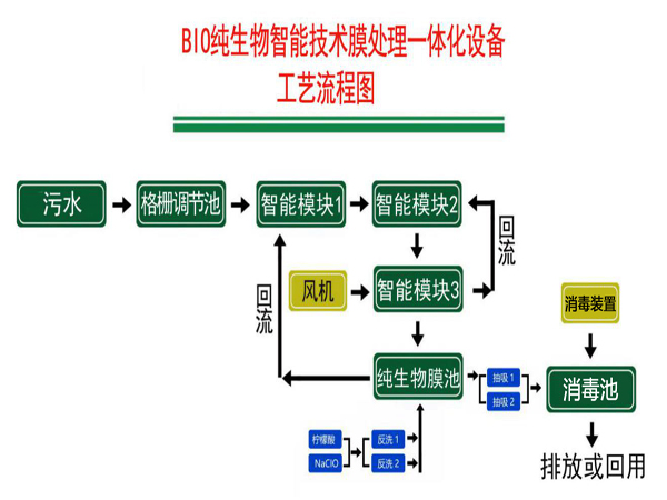 污水來水經(jīng)污水管道進(jìn)入格柵調(diào)節(jié)池,格柵調(diào)節(jié)池對(duì)污水進(jìn)行水量和水質(zhì)的調(diào)節(jié)和均化以及固液分離,調(diào)節(jié)池的污水通過動(dòng)力提升進(jìn)入智能模塊區(qū),對(duì)其進(jìn)行水解酸化通過污泥回流液中的聚磷菌釋放磷酸根并消解部分有機(jī)物,智能模塊區(qū)的污水通過自流進(jìn)入智化模塊2區(qū)通過回流混合液的亞確酸鹽及硝酸鹽在反硝化菌的作用下生成氮?dú)忉尫牛M(jìn)一步的降解污水中的有機(jī)物。智能模塊3區(qū)內(nèi)通過風(fēng)機(jī)給微生物提供氧氣,保證微生鋤正常的活動(dòng)進(jìn)行分解污水中的有機(jī)物,智能模塊3區(qū)內(nèi)污水道流到智能技術(shù)膜反應(yīng)池通過產(chǎn)水自吸泵連接浸入式膜組件,污水通過膜組件產(chǎn)水。污水進(jìn)入進(jìn)入消毒池,生物膜池濃縮污泥回流至智能模塊1繼續(xù)參與釋放并保持系統(tǒng)活性污泥濃度,另一部分則攜帶超量吸收的磷以剩余污泥的形式定期排出系統(tǒng)。