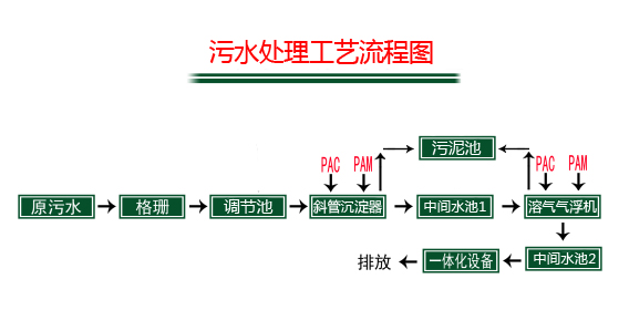 污水通過格柵渠自流進入調(diào)節(jié)池(業(yè)主土建),調(diào)節(jié)池內(nèi)的污水通過設(shè)置的污水泵抽取進入斜管沉淀器,在泥渣懸浮層上方安裝傾角60度的斜管組件,使原水中的懸浮物、固體物或經(jīng)投加混凝劑后形成的絮體礬花,在斜管底側(cè)表面積積聚成薄泥層,依靠重力作用滑回泥渣懸浮層,繼而沉入集泥斗。出水進入中間水池1,經(jīng)泵提進入溶氣氣浮機,由空氣壓縮機送到空氣罐中的空氣通過射流裝置被帶入溶氣罐,在0.35Mpa壓力下被強制溶解在水中,形成溶氣水,送到氣浮槽中。在突然釋放的情況下,溶解在水中的空氣析出,形成大量的微氣泡群,同泵送過來的并經(jīng)加藥后正在絮凝的污水中的懸浮物充分接觸,并在緩慢上升過程中吸附在絮集好的懸浮物中,使其密度下降而浮至水面,達到去除SS和CODcr的目的。出水自流進入中間水池2,經(jīng)泵提進入一體化設(shè)備,A/O工藝將前段缺氧段和后段好氧段串聯(lián)在一起,A段DO不大于0.2mg/L,O段DO=2~4mg/L。在缺氧段異養(yǎng)菌將污水中的淀粉、纖維、碳水化合物等懸浮污染物和可溶性有機物水解為有機酸,使大分子有機物分解為小分子有機物,不溶性的有機物轉(zhuǎn)化成可溶性有機物,當這些經(jīng)缺氧水解的產(chǎn)物進入好氧池進行好氧處理時,可提高污水的可生化性及氧的效率;在缺氧段,異養(yǎng)菌將蛋白質(zhì)、脂肪等污染物進行氨化游離出氨(NH3、NH4+),在充足供氧條件下,自養(yǎng)菌的硝化作用將NH3-N(NH4+)氧化為NO3-,通過回流控制返回至A池,在缺氧條件下,異氧菌的反硝化作用將NO3-還原為分子態(tài)氮(N2)完成C、N、O在生態(tài)中的循環(huán),實現(xiàn)污水達標排放。