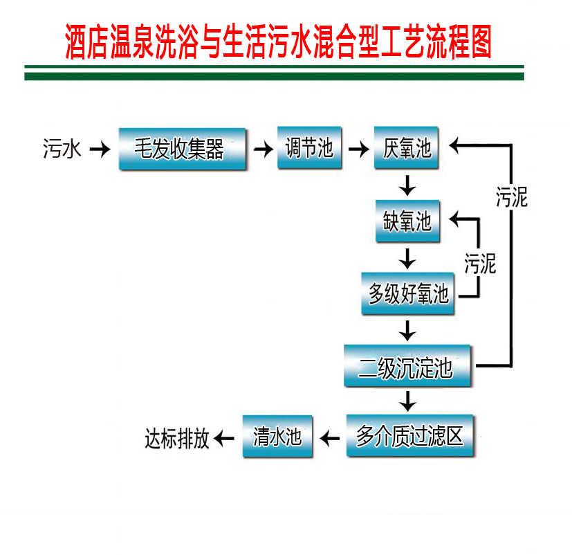 首先通過毛發(fā)收集器攔截,對(duì)污水進(jìn)行預(yù)處理,目的是初步降低無機(jī)顆粒物質(zhì)的含量,提高污水的同一性和可生化性;接著由提升泵定量提升至調(diào)節(jié)池進(jìn)行水質(zhì)水量的調(diào)節(jié),經(jīng)調(diào)節(jié)后的污水通過缺氧好氧A/O/O/O生物接觸氧化法,利用生物膜的作用使有機(jī)污染物首先轉(zhuǎn)化為氨氮,同時(shí)通過好氧硝化和缺氧反硝化過程既去除有機(jī)物又去除了氨氮。生化池配以新型的高密型彈性立體填料,該填料具有負(fù)荷高、施工簡(jiǎn)易、體積小、運(yùn)行穩(wěn)定可靠、管理方便、維修更換方便等優(yōu)點(diǎn);生化池的出水進(jìn)入二沉淀池進(jìn)行固液分離,二沉淀池具有固液分離效果好、投資省、對(duì)沖擊負(fù)荷和溫度變化適應(yīng)能力強(qiáng)、施工簡(jiǎn)易等特點(diǎn);二沉淀池出水進(jìn)入多介質(zhì)過濾器除去水中雜質(zhì),經(jīng)多介質(zhì)過濾區(qū)處理后能確保污水經(jīng)處理后各項(xiàng)指標(biāo)全面達(dá)標(biāo)。